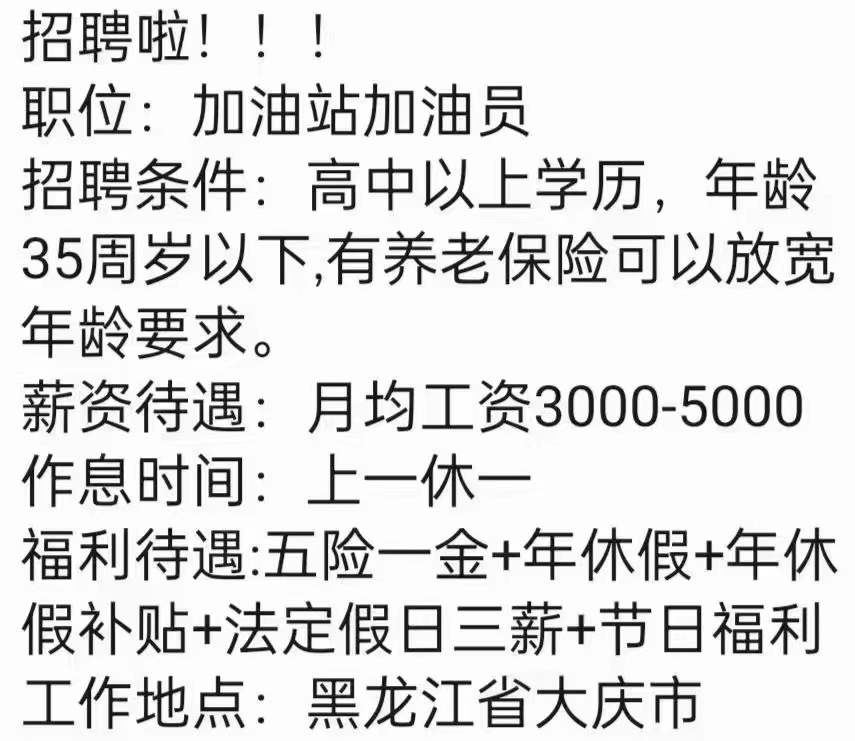 中石化加油員,大慶市區(qū)內(nèi)。