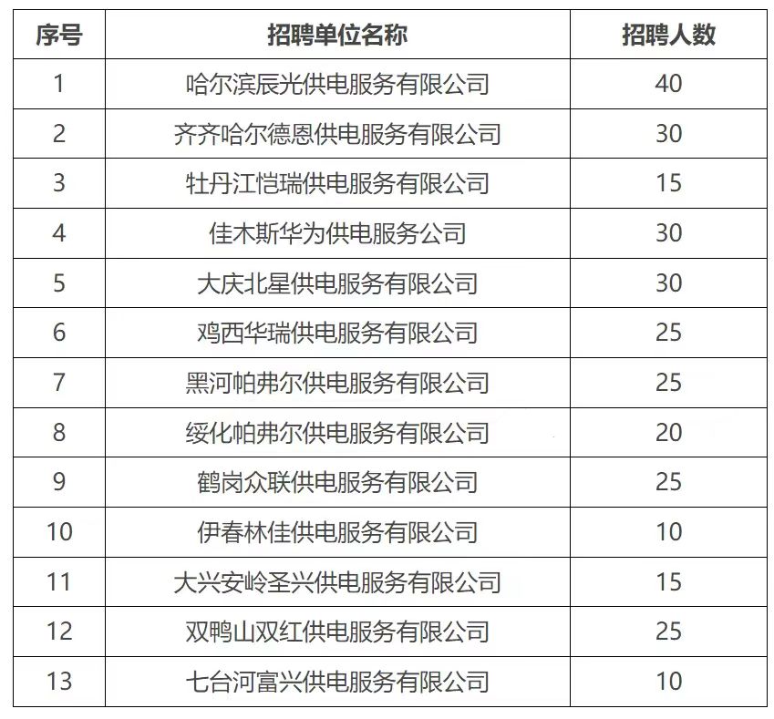 為進(jìn)一步提高鄉(xiāng)村供電服務(wù)水平,結(jié)合供電服務(wù)公司發(fā)展需求,充實(shí)基層供電服務(wù)力量,黑龍江省各地供電服務(wù)公司組織開展2024年供電服務(wù)職工招聘工作,現(xiàn)將有關(guān)事項(xiàng)公告如下:
