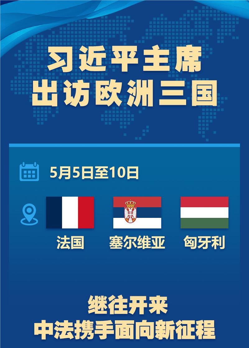 ??應(yīng)法蘭西共和國總統(tǒng)馬克龍、塞爾維亞共和國總統(tǒng)武契奇、匈牙利總統(tǒng)舒尤克和總理歐爾班邀請,國家主席習(xí)近平將于5月5日至10日對上述三國進(jìn)行國事訪問。