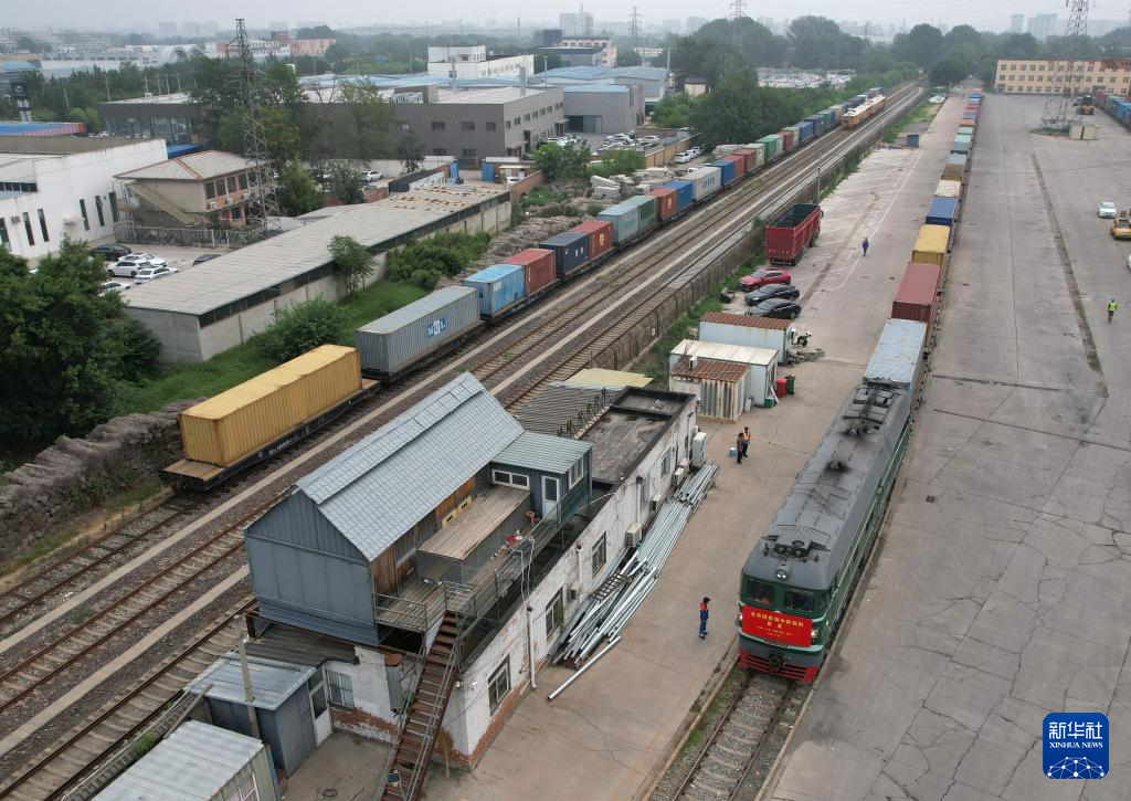 6月30日,北京至阿塞拜疆巴庫的跨里海中歐班列停靠在位于北京市房山區(qū)的北京國際陸港等待發(fā)車(無人機照片)。